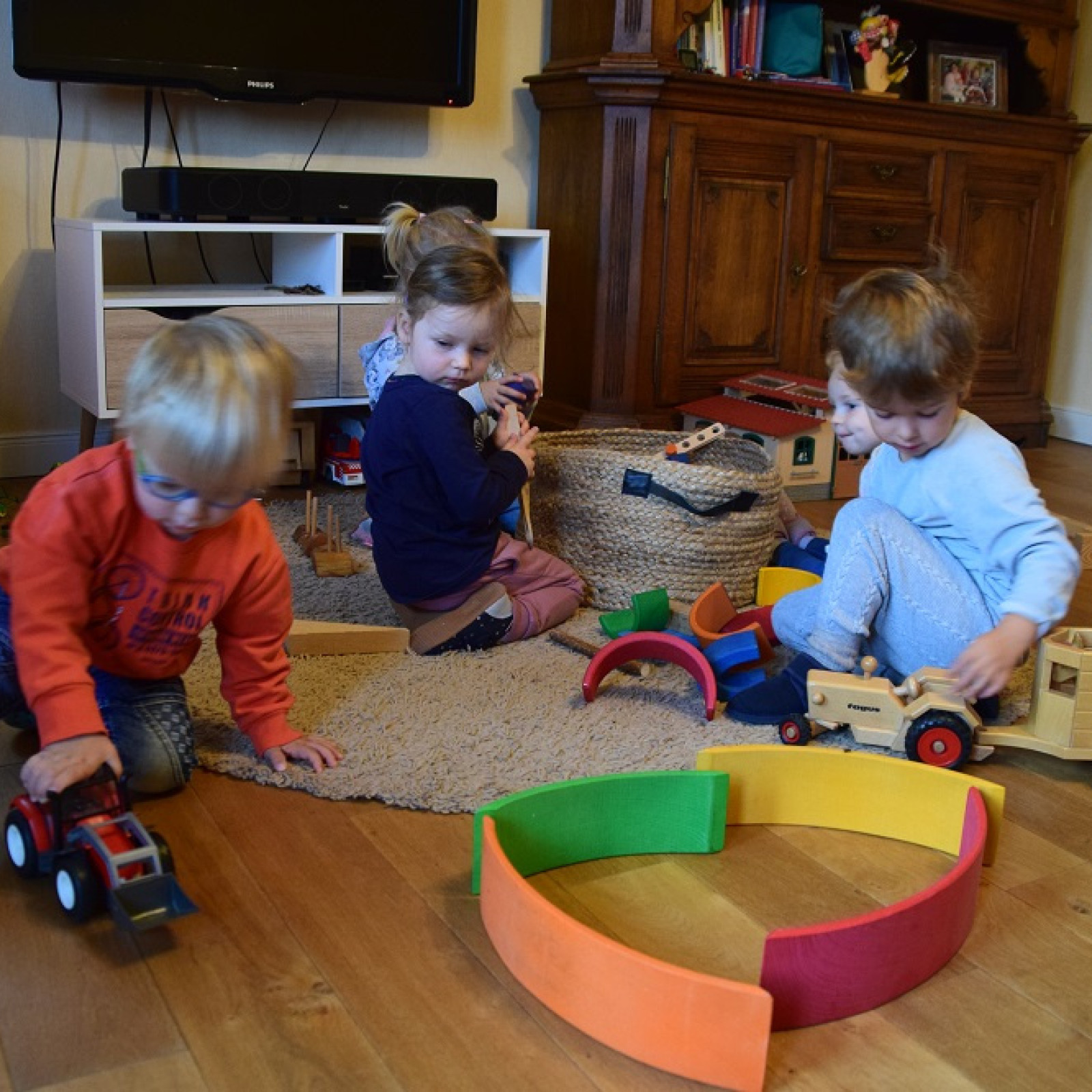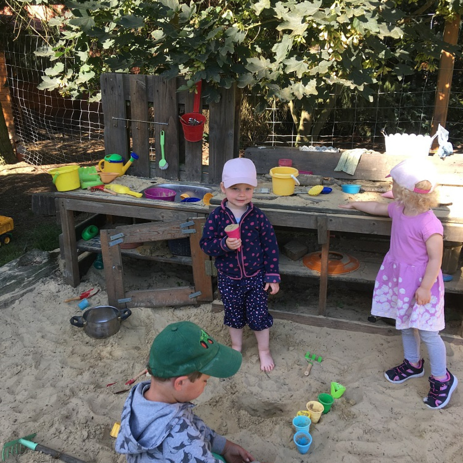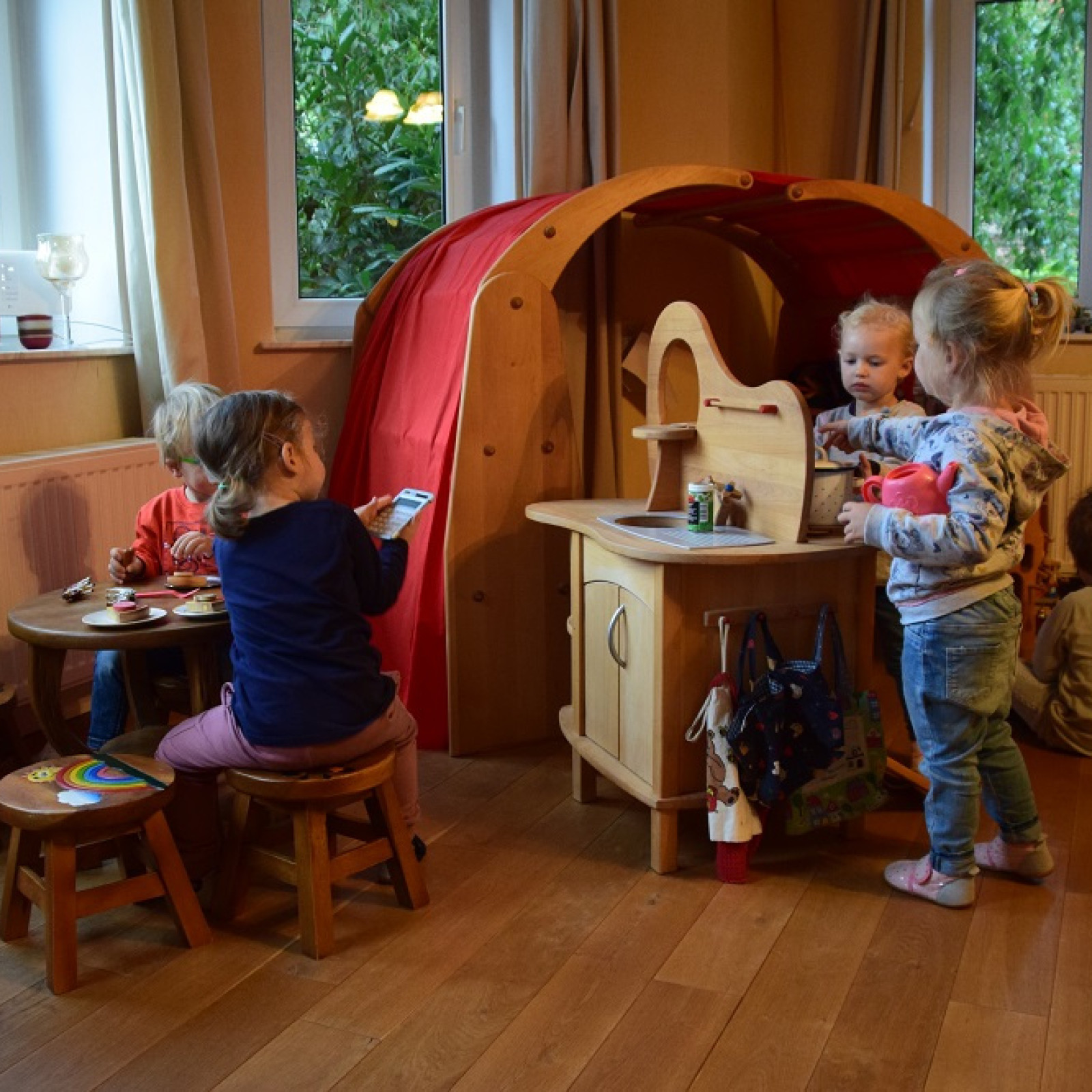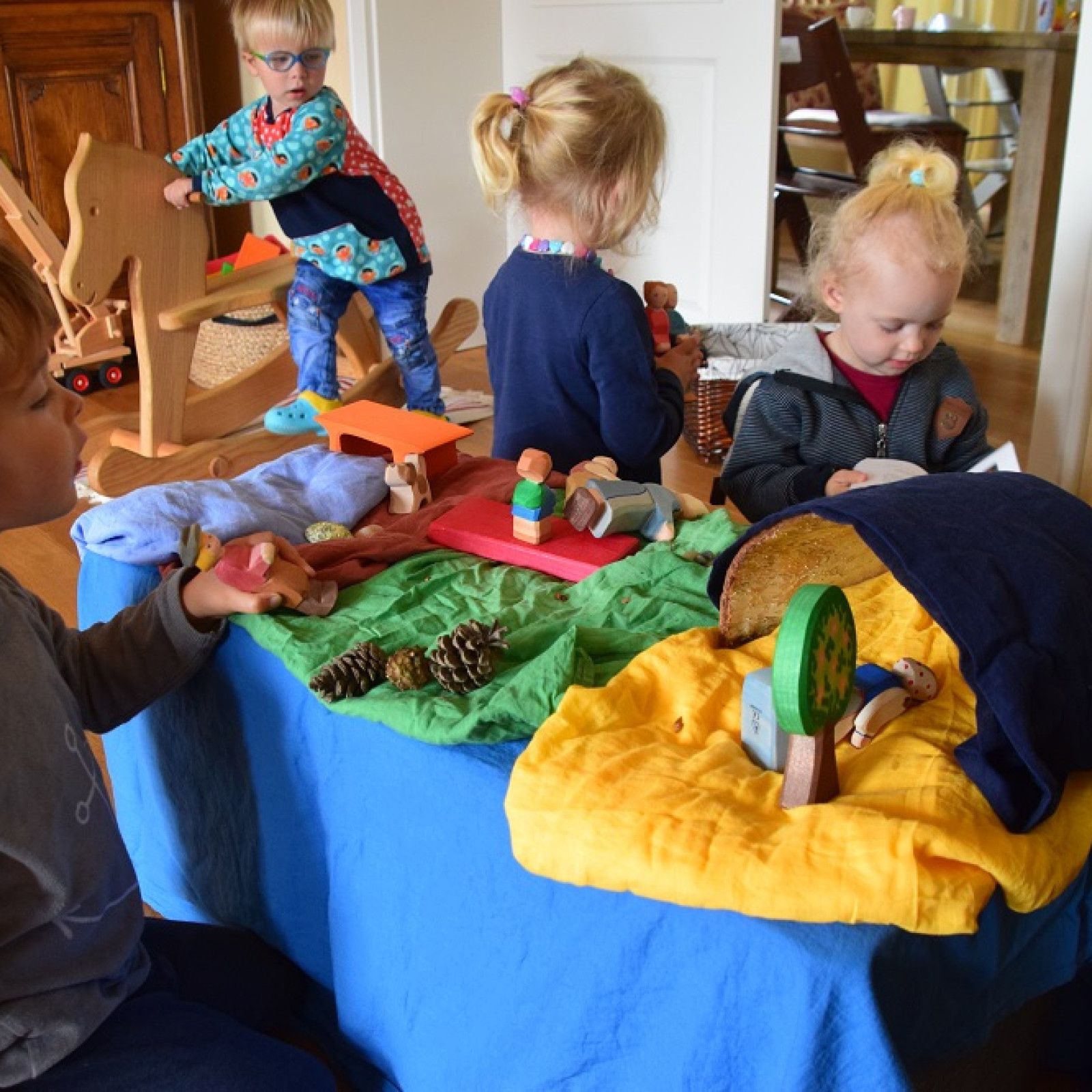 Daneben ist das Freispiel ein großer Bestandteil des Tages. Dieser freie Raum ist sehr wichtig für die Kinder, weil sie hier ihre Fantasie entfalten, Tätig sein können, Körpererfahrungen machen und soziales Miteinander erfahren. Hierfür stehen Materialien wie Körbe mit Holzklötzen, Kastanien und Kiefernzapfen, Spieltücher und eine mit Kochlöffeln und Töpfen eingerichtete Puppenküche zur Verfügung. Es gibt außerdem Bälle, Fahrzeuge und Kuscheltiere.
